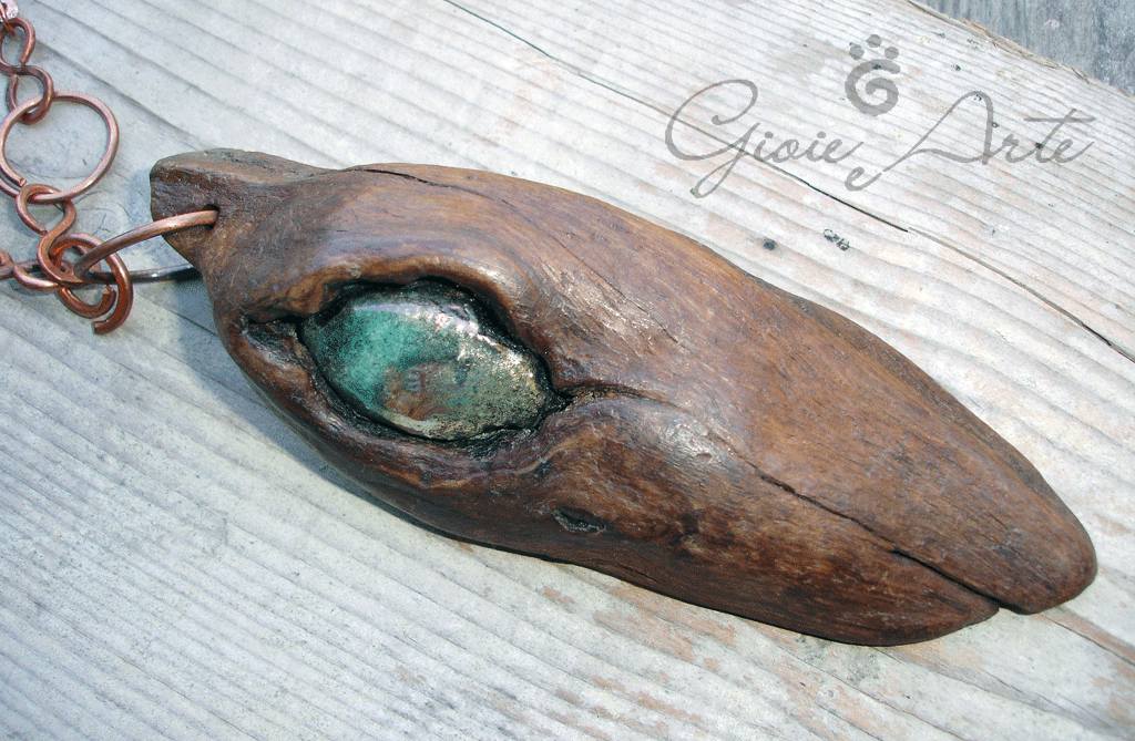 EliminaLa collana in rame è molto bello e il pendente cosi' particolare mi richiama ai racconti del "Signore degli anelli". bell'accostamento la bella perla Raku col legno di questa foggia e colore.