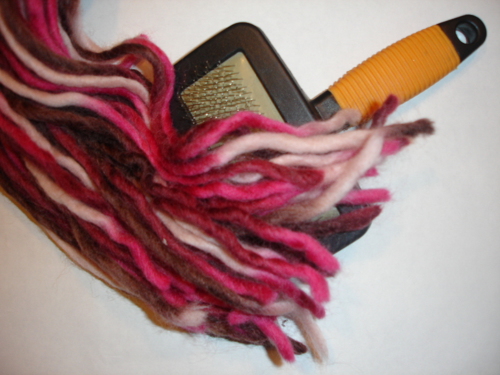Considerando che non sempre è facile trovare la lana cardata (non parliamo poi dei prezzi...!), ho fatto il mio primo esperimento utilizzando un gomitolo di pura lana e cardandolo con la spazzolina di metallo che si usa per pettinare i gatti ( nello specifico Bisoù...)