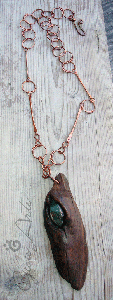 EliminaLa collana in rame è molto bello e il pendente cosi' particolare mi richiama ai racconti del "Signore degli anelli". bell'accostamento la bella perla Raku col legno di questa foggia e colore.