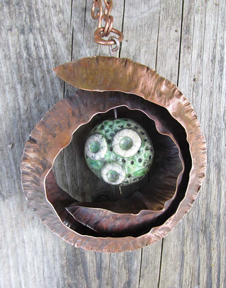 L'ultima creazione è una collana realizzata con lastra di rame lavorata con tecnica fold forming e ciondolo in ceramica raku.
