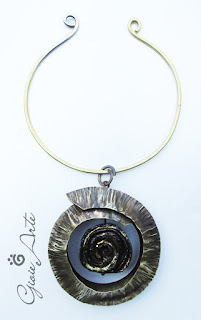 Realizzato con l'ottone, questo girocollo e decorato con un elemento centrale un ceramica raku smaltata con nitrato di argento.